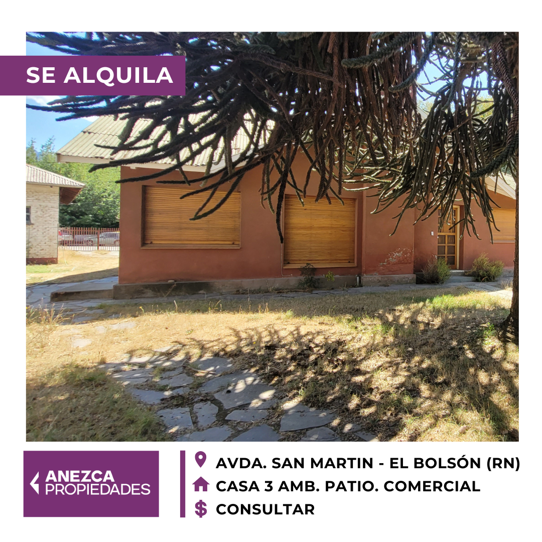 SE ALQUILA DE FORMA PERMANENTE CASA DESTINO COMERCIAL DE 4 AMBIENTES EN PLENO CENTRO DE EL BOLSÓN. CONTRATO POR 3 AÑOS, CON TODOS LOS SERVICIOS. AJUSTE CUATRIMESTRAL, INDICE -ACORDAR-.